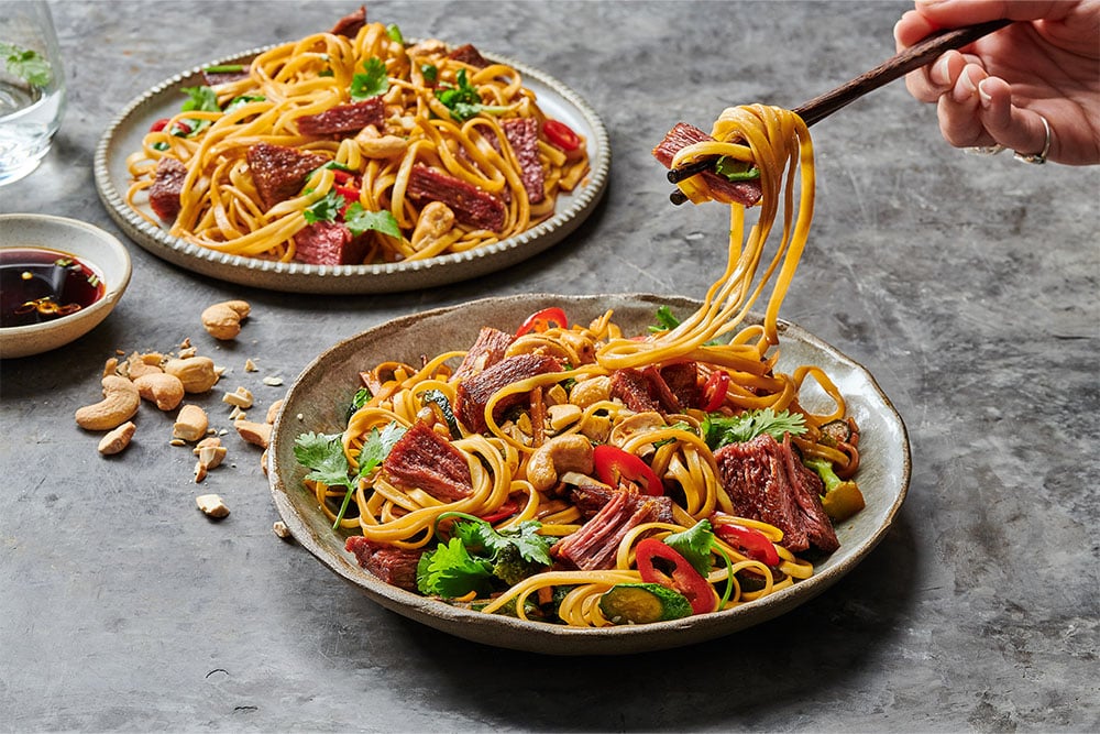 Das Flank Steak mit 1 Esslöffel Öl, Salz und schwarzem Pfeffer würzen, in den Ofen schieben und etwa 12 Minuten rösten.