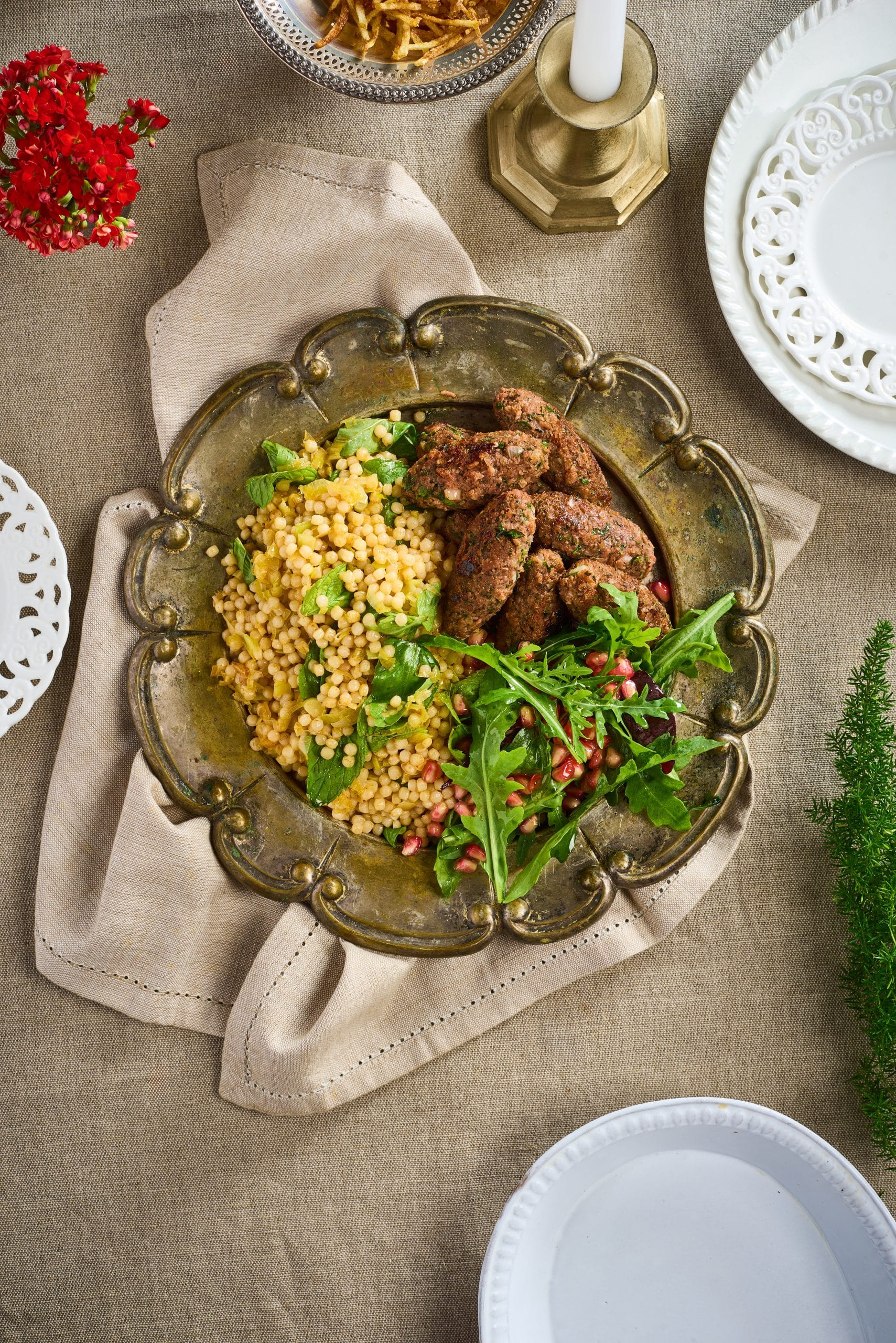 4. Couscous auf Teller verteilen, 2–3 Kofta Bällchen darauf anrichten, mit Glasur, Kräutern und Granatapfelkernen garnieren.