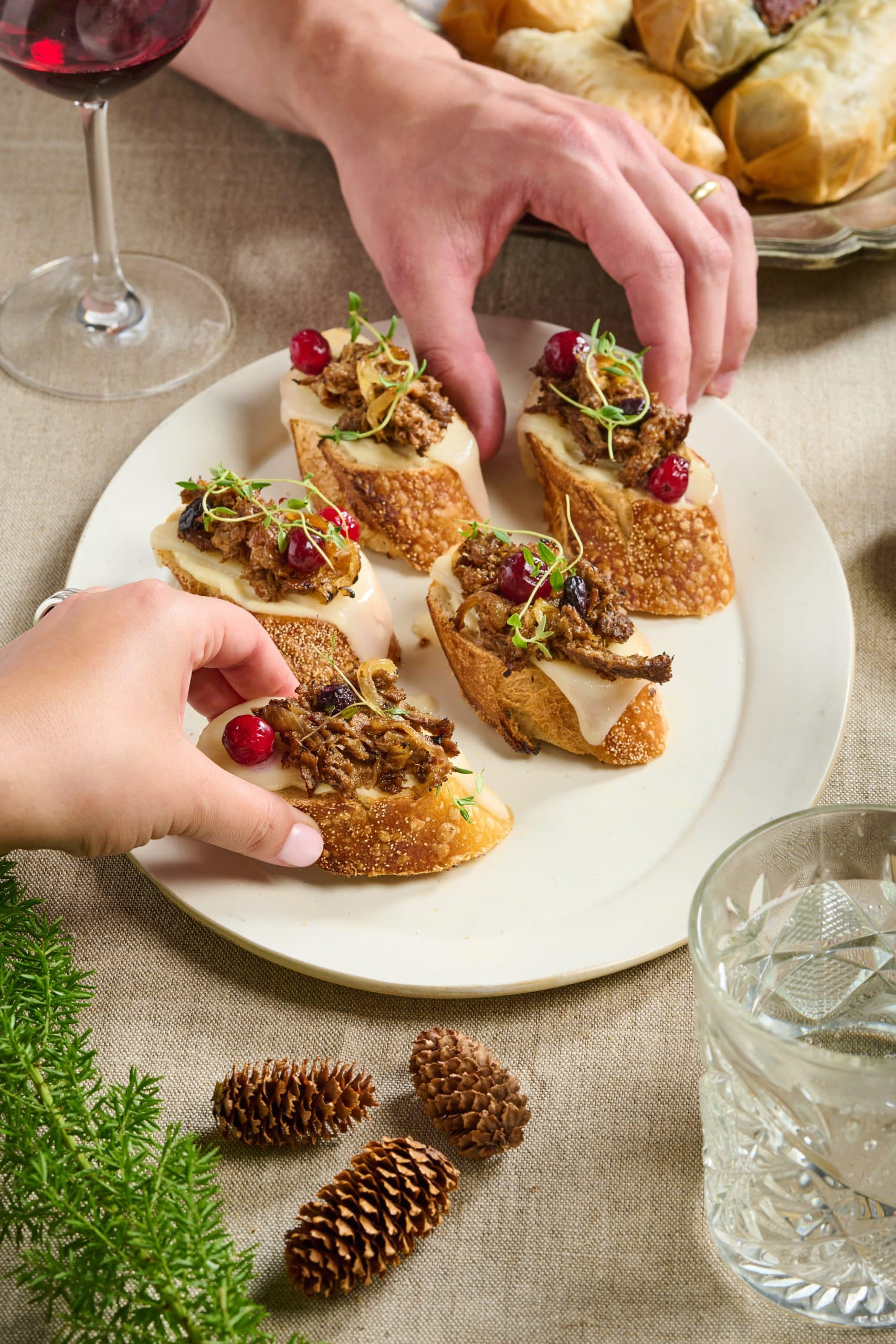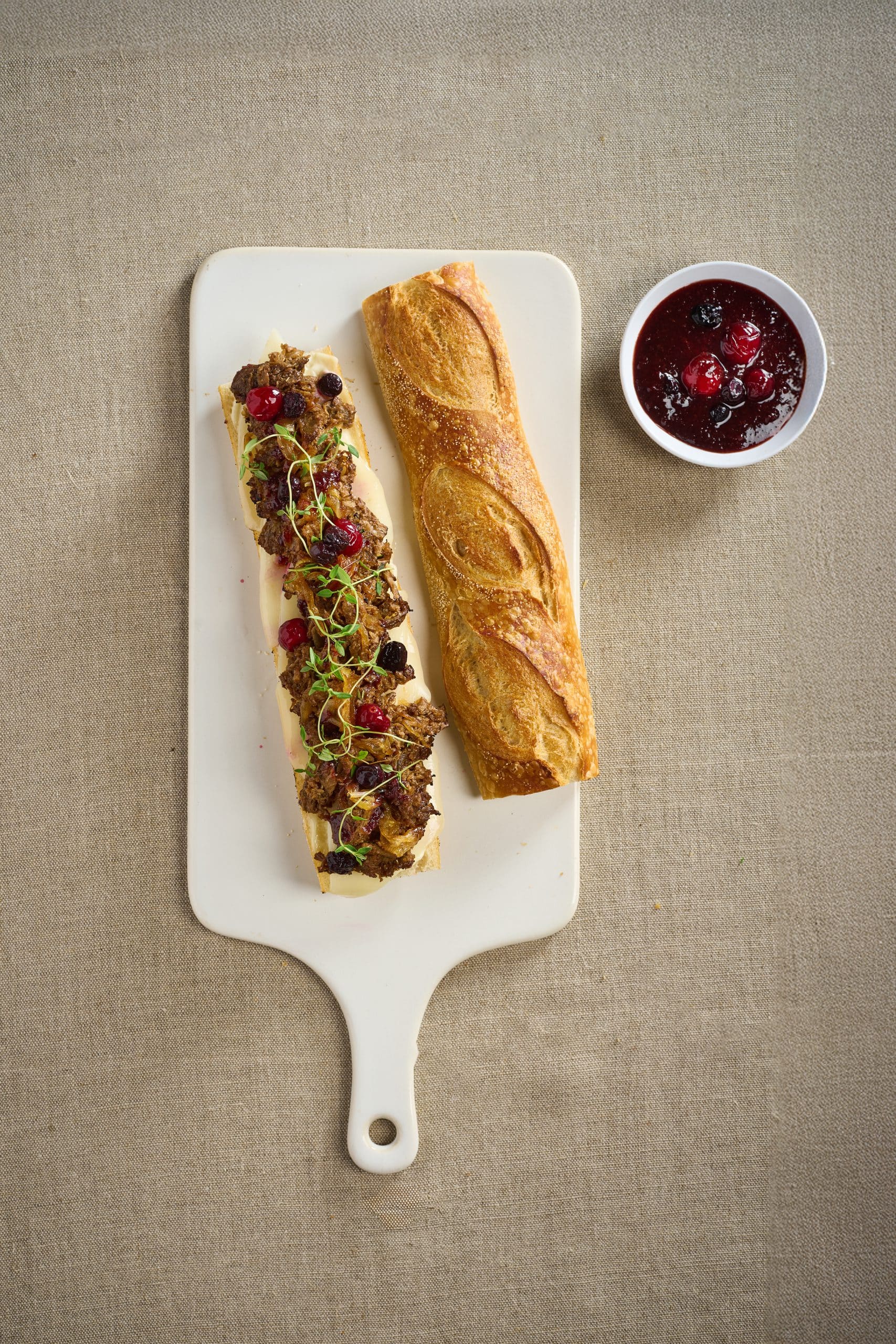 3. Baguette in der Mitte durchschneiden, die untere Seite mit Mayonnaise, die obere Seite mit Preiselbeermarmelade bestreichen. Redefine Pulled mit den Zwiebeln auf das Baguette geben, mit Raclette-Käse belegen und den Käse kurz unter dem Grill schmelzen.