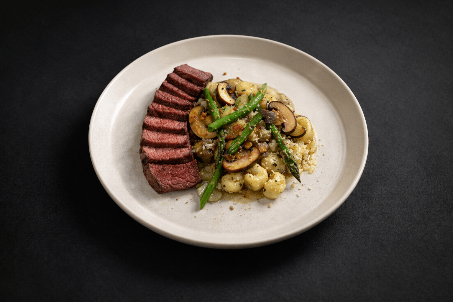 7. Slice the Flank and cut the Asparagus in 2 and serve over the Gnocchi.