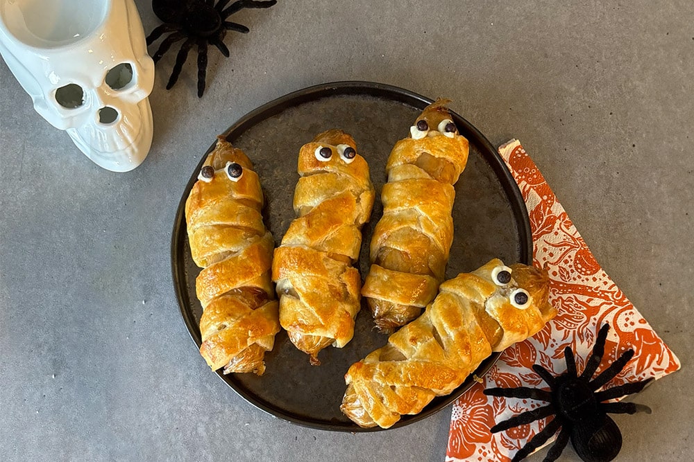 6. Drizzle small dots of mayonnaise on each sausage to create “eyeballs,” and place a whole black peppercorn in the centre of each dot as the pupil.