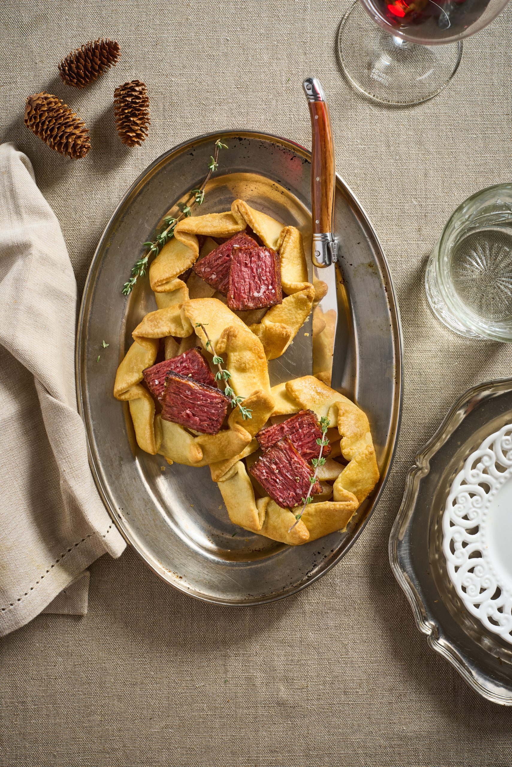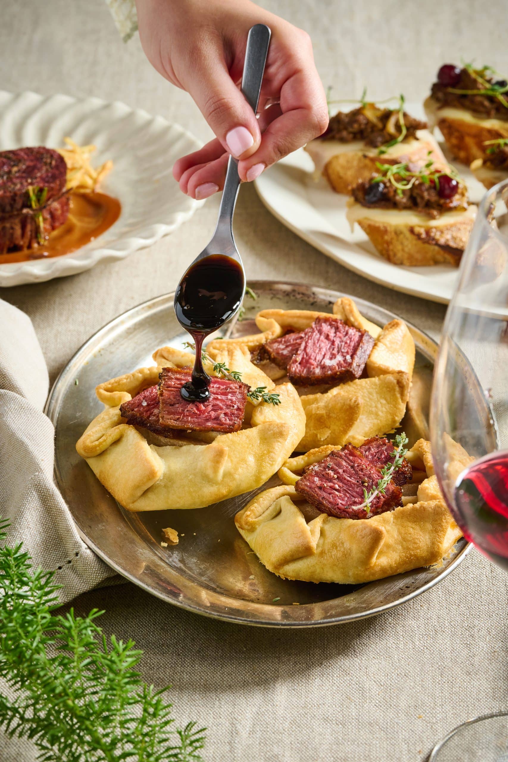 4. Remove the galettes from the oven, top each with sliced flank, and drizzle with olive oil and balsamic glaze. Garnish with extra thyme leaves and black pepper.